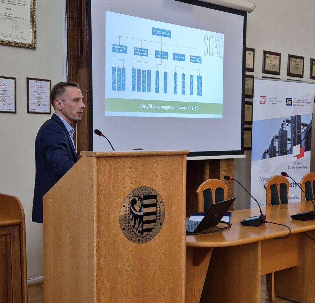 Przedstawiciel firmy SOKE Sp. z o.o. Kamil Korba w prezentacji „Rola magazynów energii elektrycznej” wyjaśnił wpływ nowoczesnych magazynów energii na stabilność zasilania, optymalizację kosztów oraz rozwój systemów energetycznych.