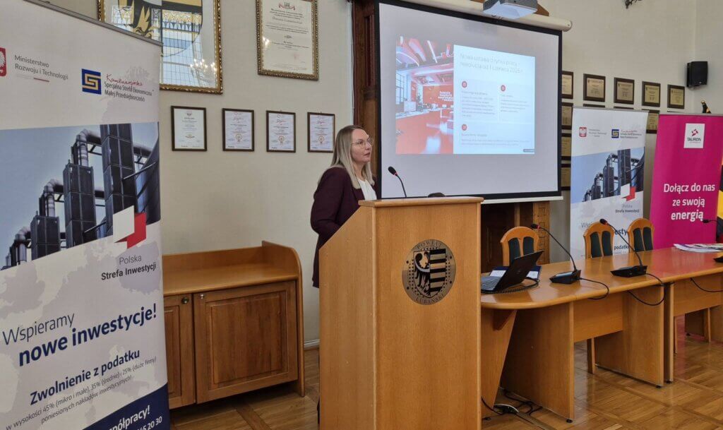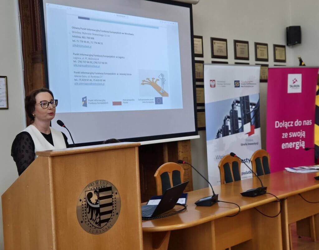 Magdalena Chmielińska-Roznek z Punktu Informacyjnego Funduszy Europejskich w Jeleniej Górze przedstawiła aktualne możliwości wsparcia z funduszy unijnych, zasady aplikowania o środki oraz rolę PIFE w doradztwie dla przedsiębiorców.