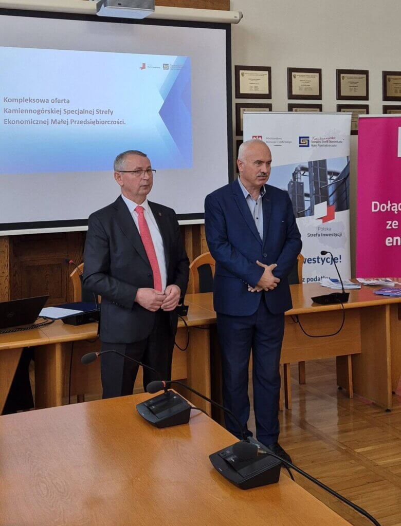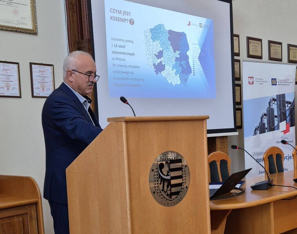 Następnie głos zabrał Wiceprezes SSEMP S.A. Robert Greb, prezentując kompleksową ofertę inwestycyjną Kamiennogórskiej Specjalnej Strefy Ekonomicznej Małej Przedsiębiorczości. Szczegółowo omówił zasady inwestowania w ramach Polskiej Strefy Inwestycji, w tym możliwości uzyskania atrakcyjnych ulg podatkowych dla przedsiębiorców planujących nowe projekty lub rozwój już istniejących działalności.