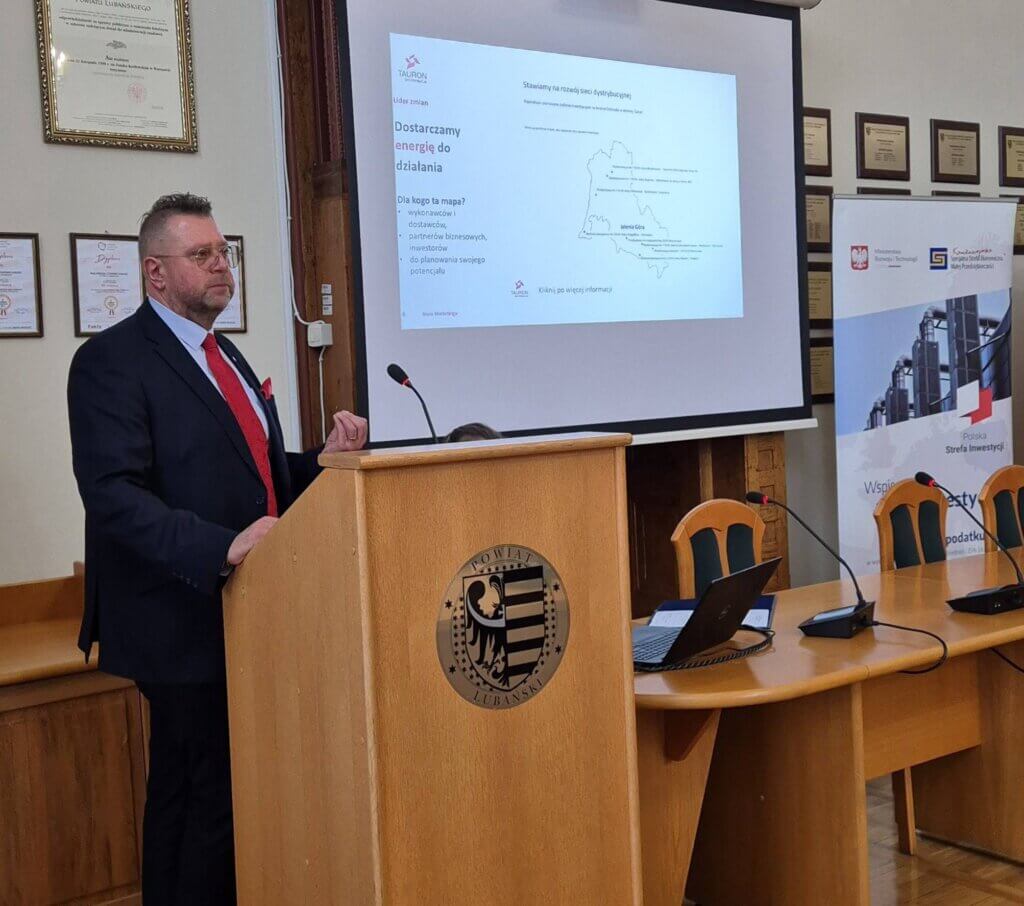 Krzysztof Gajewski – Pełnomocnik ds. Kontaktów z Samorządami #TAURONDystrybucja S.A. – zaprezentował nową Interaktywną Mapę Inwestycji i Przyłączeń Sieciowych. Narzędzie to ułatwia inwestorom ocenę potencjału lokalizacji, m.in. poprzez analizę obciążenia stacji elektroenergetycznych. Ponadto wytłumaczył w jaki sposób korzystać z kompasu energetycznego, który pokazuje bieżące ceny energii i pozwala zoptymalizować jej zużycie.