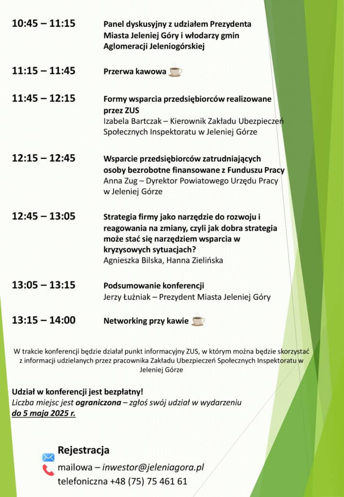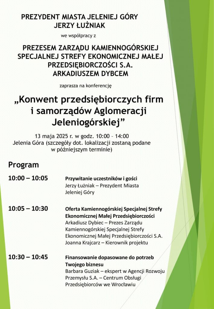 Udział w konferencji jest bezpłatny, a liczba miejsc ograniczona – zgłoszenia prosimy przesyłać do 5 maja 2025 r. mailowo: inwestor@jeleniagora.pl lub telefonicznie: 75 75 461 61.