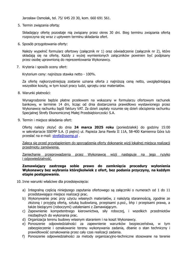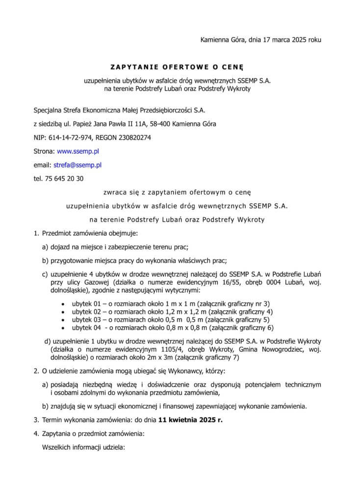 ZAPYTANIE OFERTOWE O CENĘ uzupełnienia ubytków w asfalcie dróg wewnętrznych SSEMP S.A. na terenie Podstrefy Lubań oraz Podstrefy Wykroty