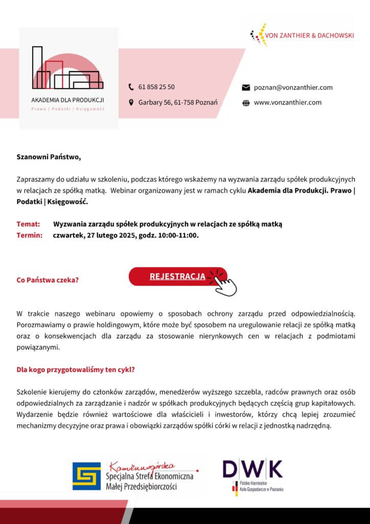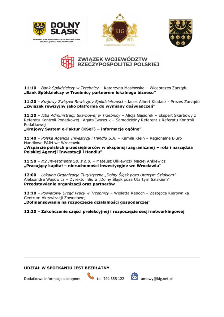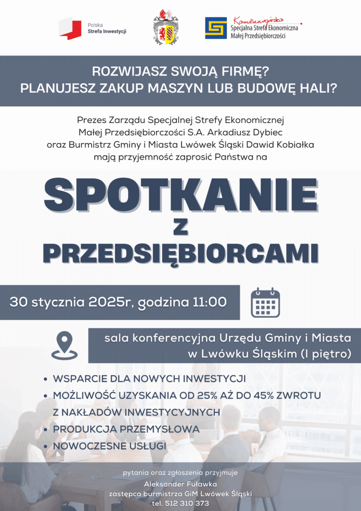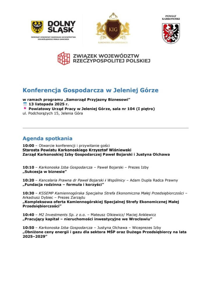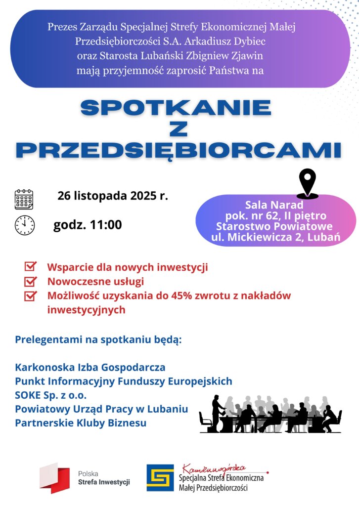 𝐙𝐚𝐩𝐫𝐚𝐬𝐳𝐚𝐦𝐲 𝐧𝐚 𝐬𝐩𝐨𝐭𝐤𝐚𝐧𝐢𝐞 𝐳 𝐩𝐫𝐳𝐞𝐝𝐬𝐢𝐞̨𝐛𝐢𝐨𝐫𝐜𝐚𝐦𝐢!Prezes Zarządu Kamiennogórskiej Specjalnej Strefy Ekonomicznej Małej Przedsiębiorczości Arkadiusz Dybiec, Prezes Karkonoska Izba Gospodarcza Paweł Bojarski oraz Małgorzata Matusiak Starosta Powiatu Trzebnickiego mają zaszczyt zaprosić Państwa na spotkanie dedykowane przedsiębiorcom oraz wszystkim zainteresowanym rozwojem gospodarczym regionu.📅 27 listopada 2025 r.,⏰ godz. 10:00,📍 sala konferencyjna Starostwa Powiatowego w Trzebnicy, ul. Leśna 1.Podczas […]