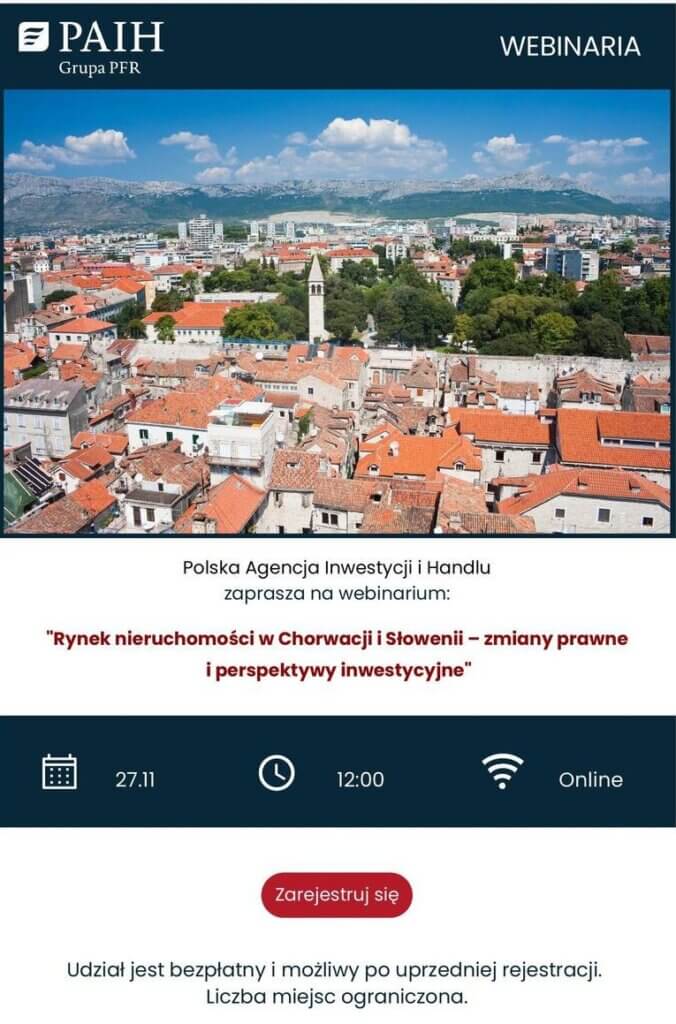 W imieniu Polska Agencja Inwestycji i Handlu – PAIH zapraszamy na webinarium „Rynek nieruchomości w Chorwacji i Słowenii – zmiany prawne i perspektywy inwestycyjne”.  27 listopada 2025  12:00  online W programie:>> informacje na temat zmian prawnych na rynku nieruchomości,>> perspektywy inwestycyjne,>> aktualne trendy oraz potencjał biznesowy dla polskich przedsiębiorców. Udział w wydarzeniu jest bezpłatny! Obowiązuje rejestracja: https://www.paih.gov.pl/…/rejestracja-rynek…/